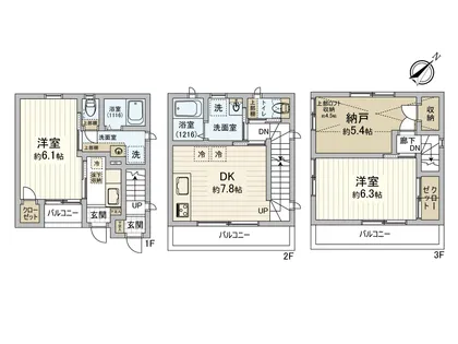 2階・3階:ダイニングキッチン約7.8帖、洋室約6.3帖、納戸:約5.4帖、ロフト約4.5帖