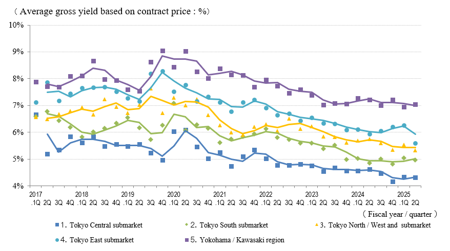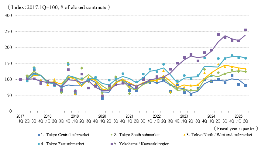 The real estate investment market in 2Q / FY 2025 showed a flat or decreasing trend in the Index of the Average Gross Yield on the Contract Price in each Tokyo submarket. At the same time, the trend in Yokohama / Kawasaki region rebounded to a slight increase. The number of contracts made showed some signs of adjustment as the number decreased YoY in in the Tokyo Central submarket and QoQ in the Tokyo South submarket. Overall, however, the number remained at a high level and the market remained active. At the same time, the polarizing trend in transactions continues, and differences in time spans until the conclusion of contracts are apparent due mainly to yields.