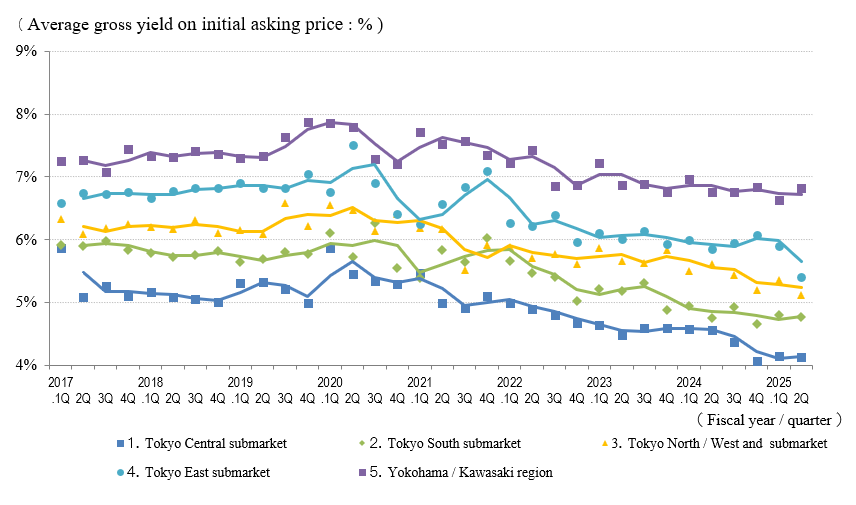 The Indices of the Average Gross Yield on the Contract Price and the Initial Asking Price in Tokyo East submarket in 2Q / FY 2025 were 5.6% (down 0.7 pt QoQ) and 5.4% (down 0.5 pt QoQ), respectively, while the number of contracts made remained somewhat stable. Both of these indices reached their lowest levels since FY 2017. A look at the details of properties for which contracts were made shows an increase in the number of relatively newer properties for which contracts were made at gross yields in the 4% range (condominium buildings completed within the past five years, including new construction). This can be considered one factor driving down overall average yields. However, since there is some variation in yields with such conditions as asset type, property age, and distance from the nearest station, it would be too early to judge from data for the current period only that market prices are increasing. The trend in the coming quarters must continue to be monitored.