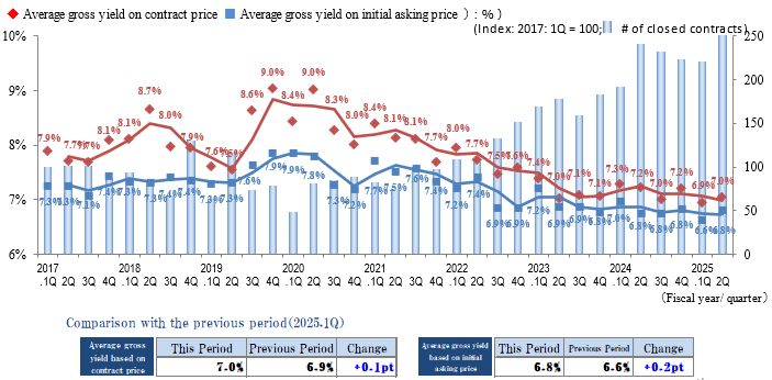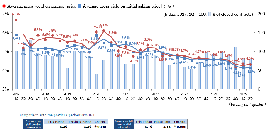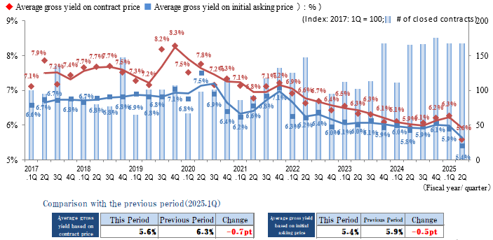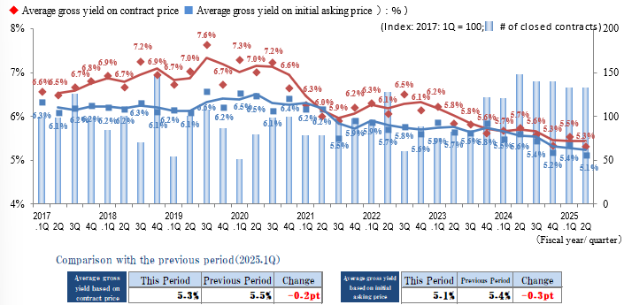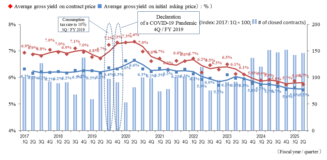 The Indices of the Average Gross Yield on the Contract Price and the Initial Asking Price both increased slightly (prices fell) in Yokohama / Kawasaki region in 2Q / FY 2025, rebounding to an increase this period after a decreasing trend had continued since 1Q / FY 2024. The number of contracts made in the region exceeded the previous record high (in 2Q / FY 2024) to set a new record high since data collection began in 2017. Despite the shadow of price inflation, the number of transactions remains high and active conditions continue in the market.