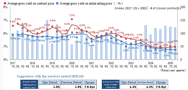 The indices of the Average Gross Yield on the Initial Asking Price and the Contract Price in Tokyo South submarket in 2Q / FY 2025 were 4.8% (± 0.0 pt QoQ) and 5.0% (± 0.0 pt QoQ), respectively. There has been no QoQ change in the indices of both initial asking and contract prices, and a look at trends over the most recent year shows that yields largely remain flat.