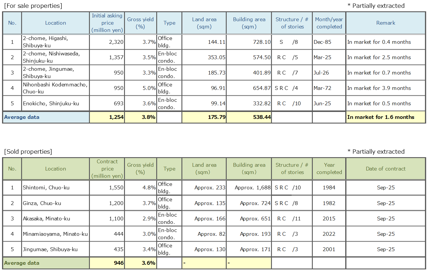 The real estate investment market in Tokyo South submarket maintains stable with strong conditions backed by the submarket's unique environment of a mixture of residential and commercial properties and high residential demand. At the same time, transactions are becoming increasingly selective, including those for existing stock, because of the rising costs of land acquisition and construction and a decrease in development sites.