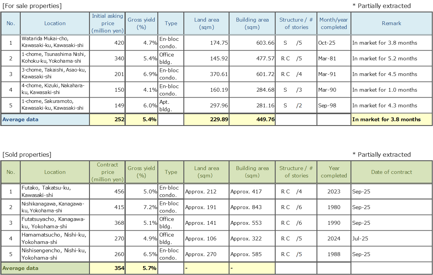 - Number of Transactions & Average Gross Yield on Contract Price: Number of contracts closed in a quarter (three months) and average gross yield of them (including estimated values)