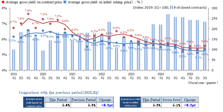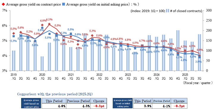 The indices of the average gross yield on the initial asking price and on the contract price both decreased slightly (prices rose) in the Yokohama / Kawasaki region in 3Q of FY 2025. Yields appear to be relatively stable over the past year or two, after they had been decreasing since 2020. While the number of contracts decreased from 2Q, when it reached a record high since data collection began in 2017, the market remains active, and numerous transactions took place during 3Q.