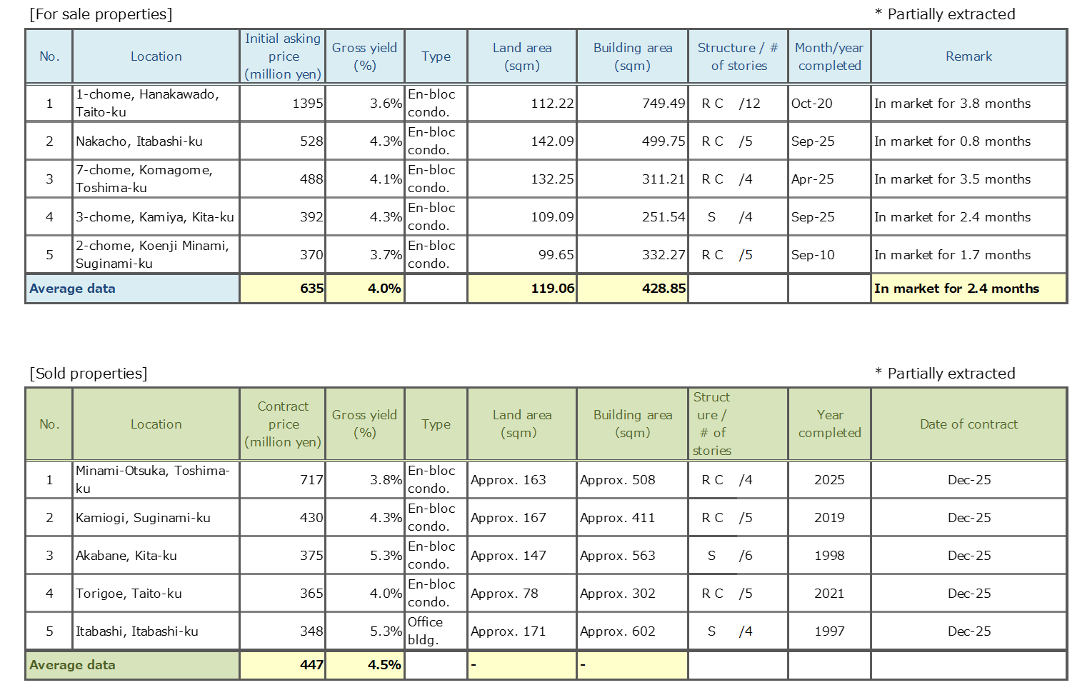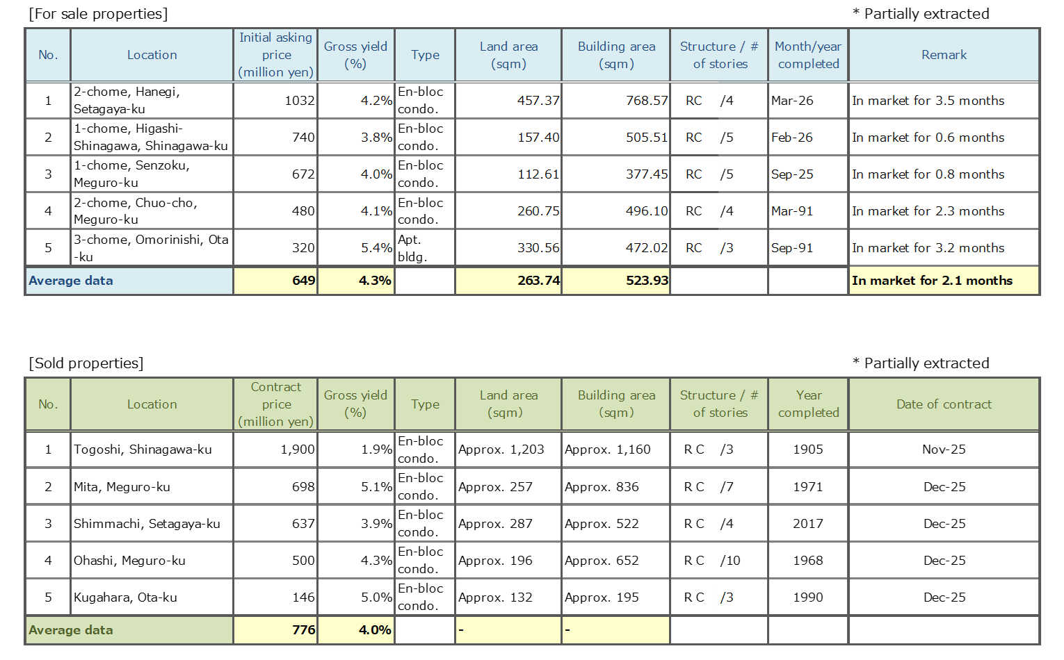 Data Source: Information is extracted from the database containing properties offered for sale and contracts concluded through Mitsui Fudosan Realty Network (En-bloc condominiums / office buildings / apartment buildings).