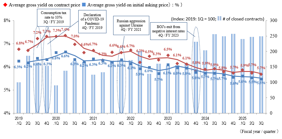 The indices of the average gross yield on the initial asking price and on the contract price were down by 0.2 points and 0.3 points quarter over quarter (QoQ) (prices rose), respectively, in the Tokyo Central submarket in 3Q of FY 2025, while the number of contracts made increased YoY. However, since this includes multiple properties contracted at low yields, conceivably for purposes of vacating and redevelopment instead of yields, the decreasing trend in yields warrants further monitoring.