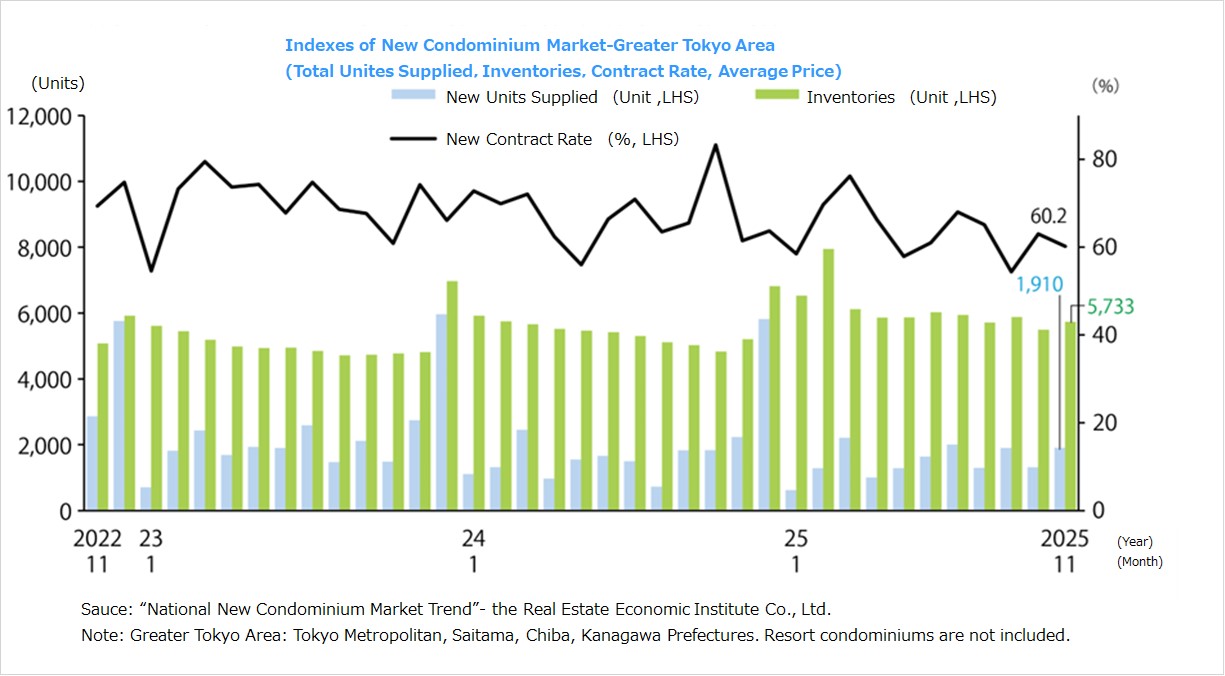 ・The number of contracts made in December 2025 was up 25.9% YoY to 3,975 units, rising for the 14th consecutive month, while the unit price per tsubo rose for the 68th consecutive month, reaching JPY 2.808 million (up 9.0% YoY). The contract price rose for the 14th consecutive month to JPY 53.40 million (up 8.2% YoY). Exclusive floor area was down 0.7% YoY to 62.77 sqm, while the inventory fell for the 5th consecutive month, to 43,381 properties (down 3.6% YoY).