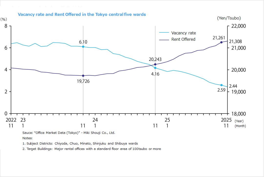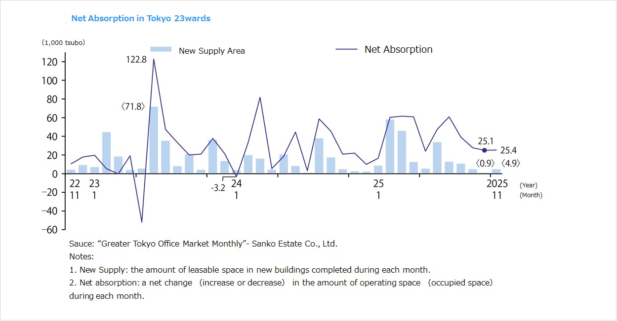 ・Net absorption (change in office occupied floor space) was +24,384 tsubo in January 2026, up 7,828 tsubo YoY, in the 23 wards of Tokyo. Cumulative annual total net absorption was 470,834 tsubo, and cumulative annual total new supply was 208,709 tsubo in 2025.