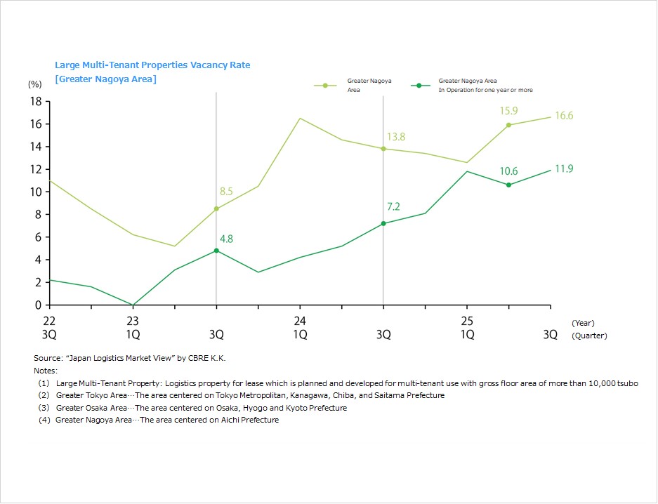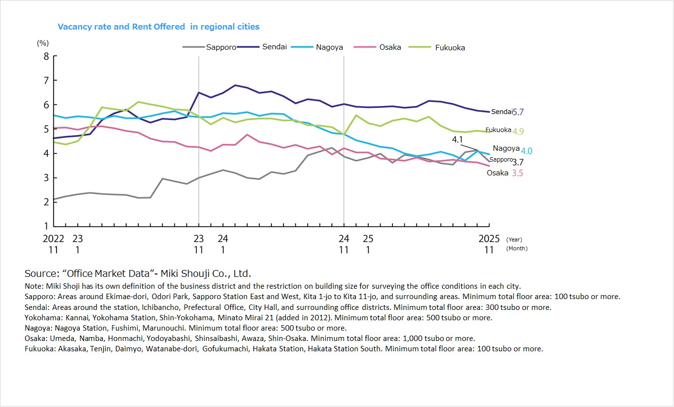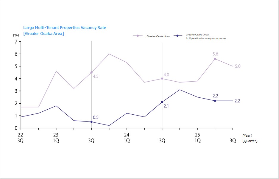 ・Vacancy rates and rents in other areas are as follows. Kinki region: 4.2% (down 0.8 ppt YoY), JPY 4,290 per tsubo (up 0.7%). One new facility, a large one with more than 70,000 tsubo in space, was completed with full occupancy. New demand of 79,000 tsubo exceeded the quarterly average over the past five years, and new demand totaled 375,000 tsubo over the full year of 2025. Demand is growing as logistics firms, e-commerce firms, and other tenants in such segments as food products and apparel aggressively expand distribution facilities. New supply in 2026 is forecast to be 167,000 tsubo, only about 40% of the 2025 level, and the vacancy rate is expected to fall to the 3% level. Chubu region: 15.5% (down 1.1 ppt), JPY 3,730 per tsubo (up 0.3%). All three new properties were completed with tenants. Vacancies are being filled in existing properties, too. New demand was high this period at 83,000 tsubo. New demand in the full year of 2025 was 148,000 tsubo, the second highest level ever. New supply in 2026 is forecast to be somewhat low at just under 40,000 tsubo in four properties. Fukuoka region: 5.6% (down 2.7 ppt), JPY 3,570 per tsubo (flat). The lack of new supply and a contract concluded on a large portion of a property completed in 3Q drove the vacancy rate down. Effective annual rent in 2025 was up 0.8% in the Fukuoka region as a whole, and new supply of 99,000 tsubo in eight properties is forecast for 2026, a record high. .