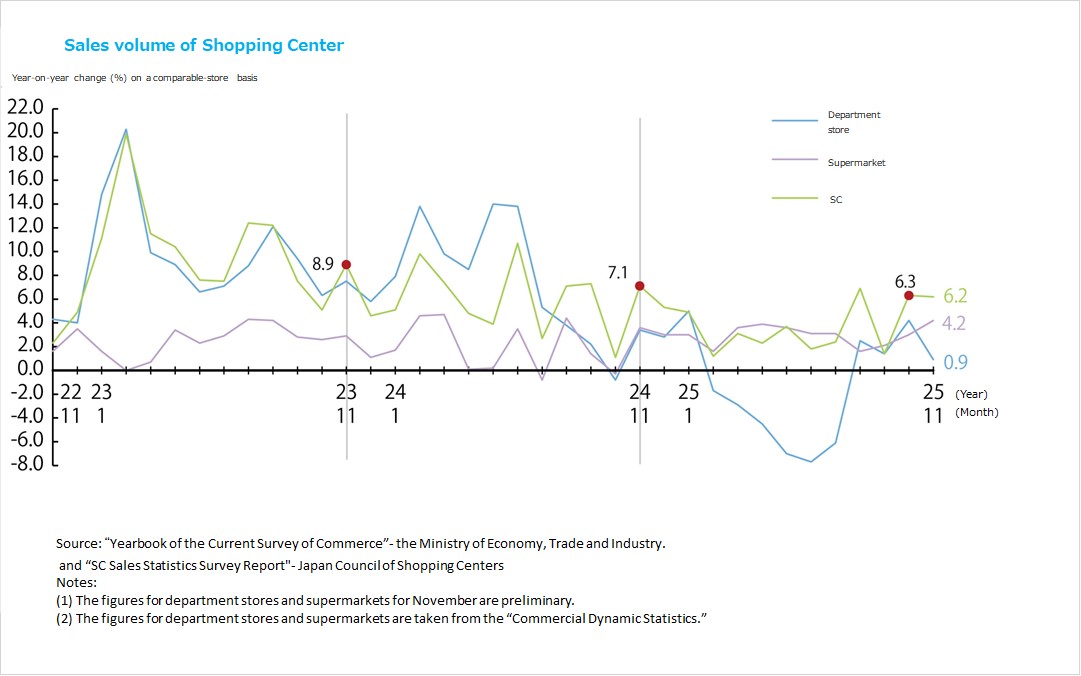・Existing store sales for shopping centers (overall) were JPY 874.85 billion in December 2025, up 1.8% YoY. Viewed by segment, conditions were challenging for sales of outerwear and other heavy apparel and winter apparel in the fashion market, while sales of character merchandise as well as seasonal gifts and New Year's demand were strong among sundries, and the demand for souvenirs as well as seasonal Christmas and New Year's demand drove favorable food sales. The trend was favorable for food and beverage services overall, powered by such uses as year-end parties, and the demand for cinemas and relaxation services was also strong.