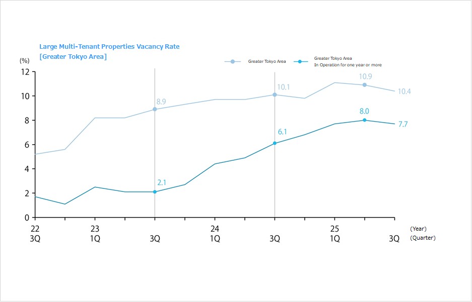 ・The vacancy rate for large multi-tenant logistics centers (LMTs) in 4Q 2025 was 9.8% (down 0.6 ppt QoQ). While the occupancy rate on completion of the 46,000 tsubo in new supply in three buildings in this quarter was low at approximately 20%, new demand was 86,000 tsubo, reflecting major contracts concluded on existing properties and other factors.
