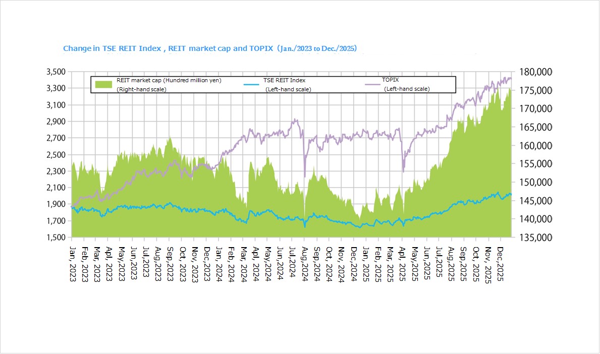 ・At the end of December 2025, the TSE REIT index was 2,013.50, up 4.8% from the end of September, and market capitalization of all J-REITs was JPY 17.4222 trillion, up 5.0% from the end of September. Despite a sharp downturn in the second half of November due to concerns about the impact of a decrease in inbound travelers as the Chinese government asked the public to refrain from traveling to Japan, the recovery trend resumed in December because China's impact appears to be limited.
